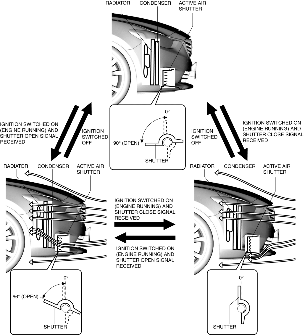 When the ignition is switched ON (engine on) and a shutter open signal is received, the shutter opens to the position 66° from the fully closed position to facilitate air flow to the radiator and condenser.