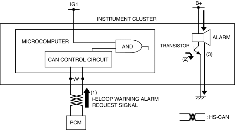 1. The instrument cluster receives (1) the i-ELOOP warning alarm request signal from the PCM.